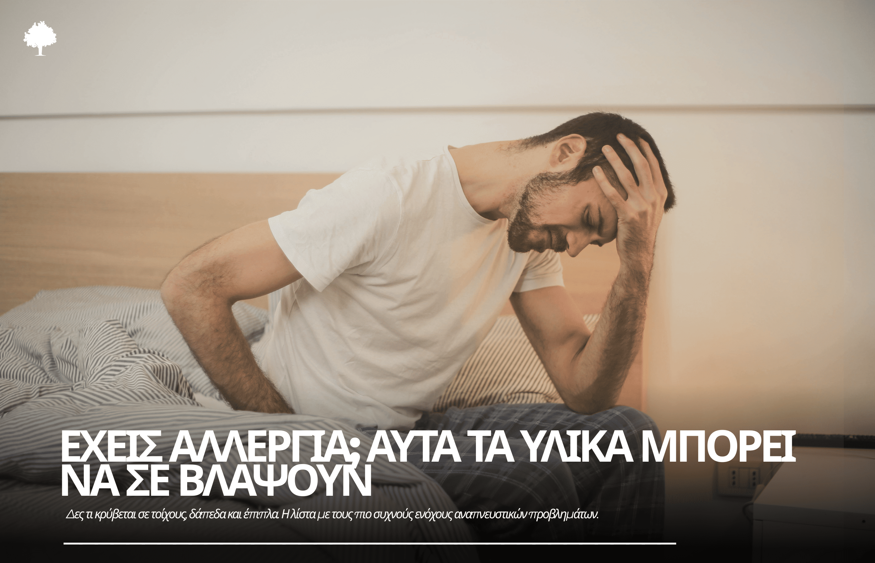 Οι αλλεργίες αποτελούν ένα ολοένα και συχνότερο πρόβλημα που επηρεάζει τόσο τα παιδιά όσο και τους ενήλικες. Συμπτώματα όπως βήχας, καταρροή, φαγούρα στα μάτια ή εξανθήματα μπορεί να είναι όχι μόνο ενοχλητικά, αλλά και να μειώνουν σημαντικά την ποιότητα ζωής. Αν και συχνά εστιάζουμε σε εξωτερικούς αλλεργιογόνους παράγοντες όπως η γύρη ή η ατμοσφαιρική ρύπανση, πολλοί δεν συνειδητοποιούν ότι ένα τεράστιο ποσοστό αλλεργιογόνων προέρχεται από τα υλικά και τα αντικείμενα που βρίσκονται μέσα στο ίδιο τους το σπίτι.