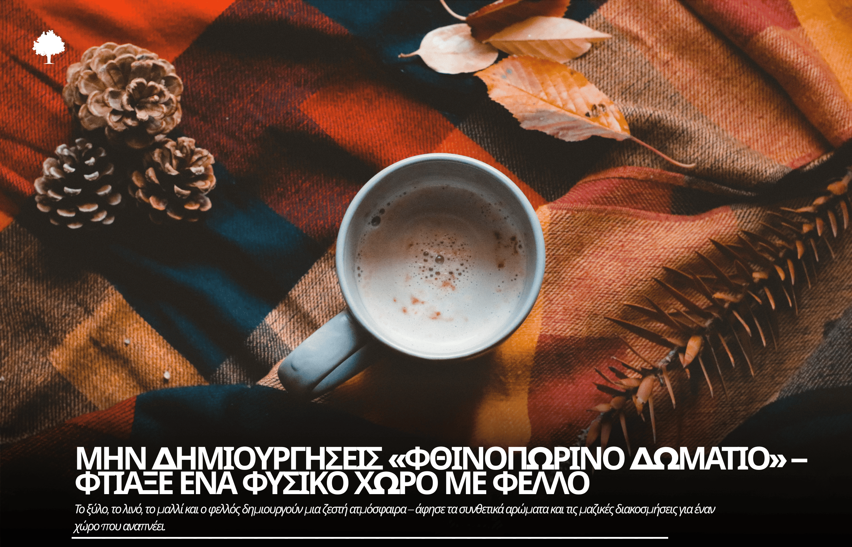Η αληθινή φθινοπωρινή ατμόσφαιρα δεν χρειάζεται πλαστικές διακοσμήσεις ούτε συνθετικά αρώματα. Το μυστικό της κρύβεται στα υλικά — σε εκείνα που από μόνα τους αποπνέουν ζεστασιά, υφή και ηρεμία. Το ξύλο, το λινό, το μαλλί ή ο φυσικό φελλό δεν είναι απλώς «πινελιές» — είναι το θεμέλιο ενός αρμονικού εσωτερικού που «αναπνέει» και σε προσκαλεί να ξεκουραστείς.